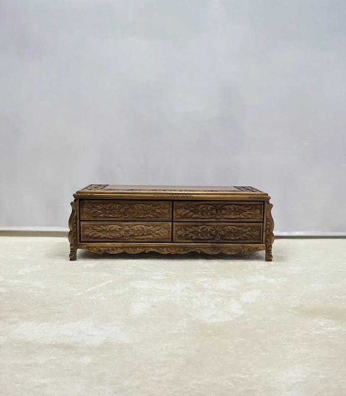 %100 doğal ceviz ağacından el oyması ile üretilmiş TV ünitesi. 4 çekmeceli kullanışlı depolama, zarif tasarım ve rustik şıklık sunar. Şimdi satın al!