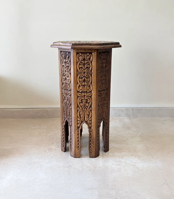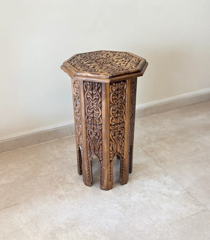 El Oyma Ceviz Ahşap Yan Sehpa 44x44x76 cm | Maraş El İşçiliği Dekoratif Sehpa Natural