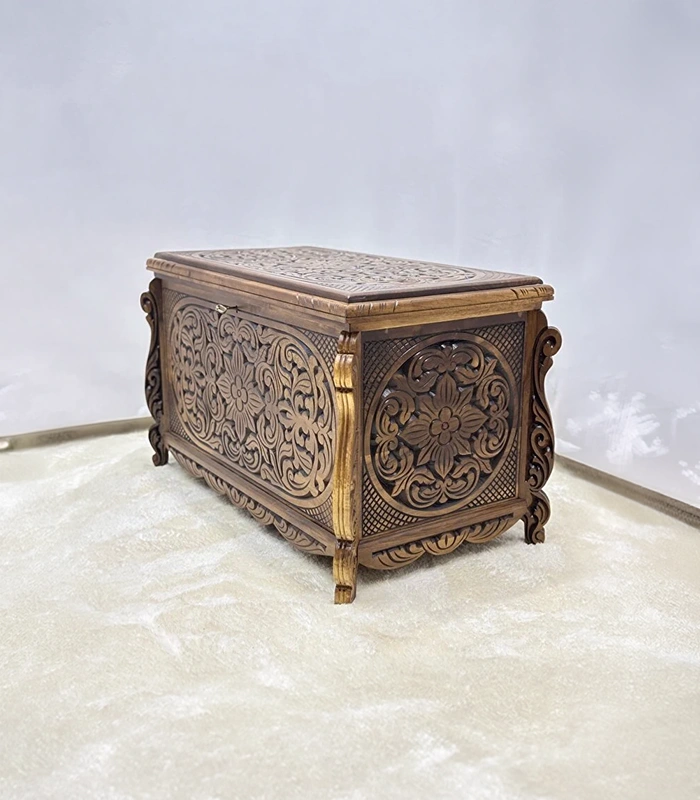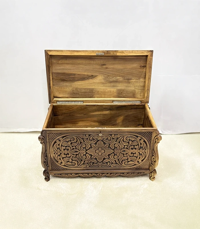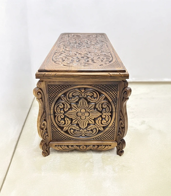 El oyma Meriç Eskitme modeli, zarif kıvrımlar ve dengeli motiflerle bezeli geleneksel bir tasarım sunar. Sandığın ön, üst ve yan yüzeylerinde yoğun el işçiliği bulunur. Her bir ürün, ustasının emeğini ve sanatını taşıdığı için kendine özgü bir karaktere sahiptir.