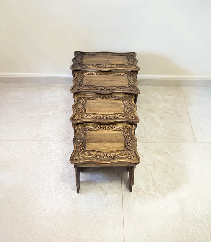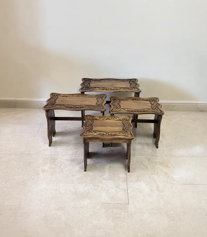 Maraş El Oyma 4’lü Servis Sehpası – 65x40x50 cm Ceviz Ahşap Zigon Sehpa Takımı