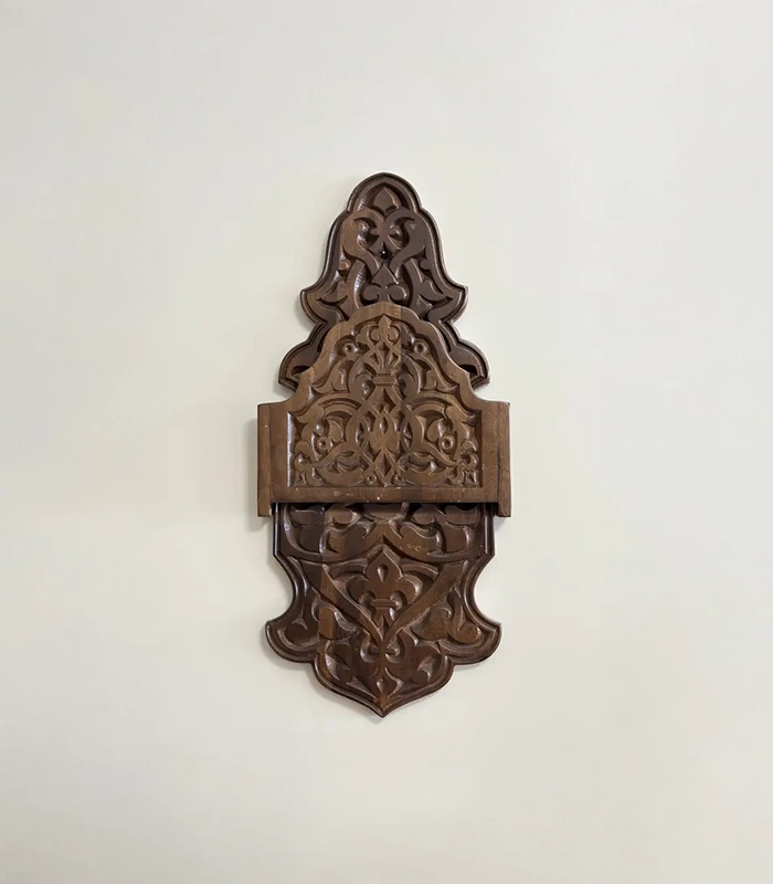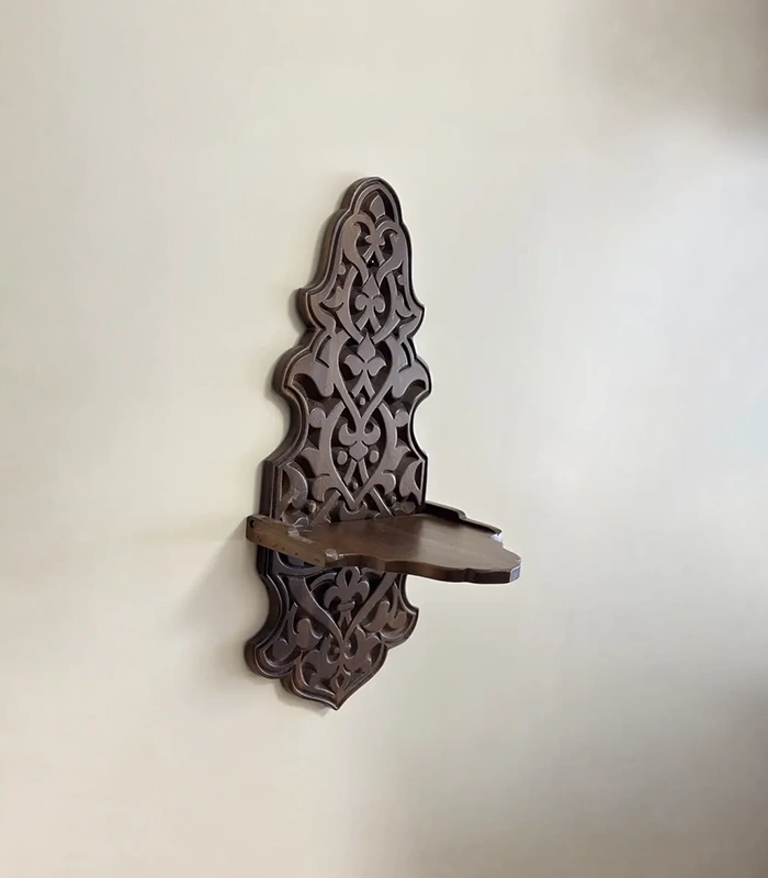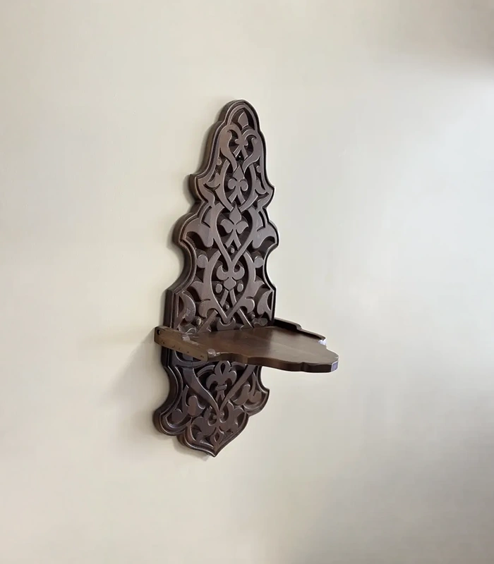 Maraş El Oyma Büyük Ceviz Kavukluk, %100 doğal ceviz ağacından el oyma işçiliği ile üretilmiş zarif ve fonksiyonel bir dekoratif raftır. Duvara monte edilebilir ve takke, kavuk gibi objeleri sergilemek için idealdir.