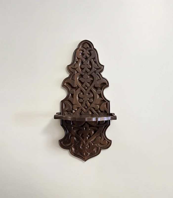 Maraş El Oyma Büyük Ceviz Kavukluk, %100 doğal fırınlanmış kök ceviz ağacından üretilmiş, zarif ve fonksiyonel bir dekoratif raf olarak öne çıkıyor. Osmanlı ve Selçuklu sanatından ilham alan motiflerle el oyma işçiliğiyle tasarlanmış olan bu kavukluk, takke, kavuk ve özel objelerinizi sergilemeniz için geniş bir alan sunar. Duvara monte edilebilen sağlam yapısı sayesinde hem estetik hem de güvenlidir.