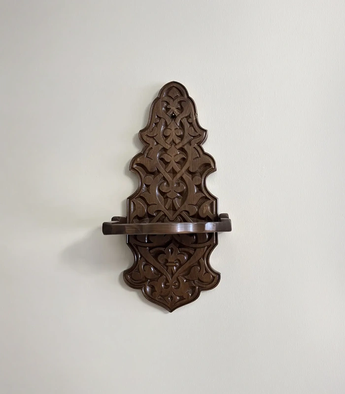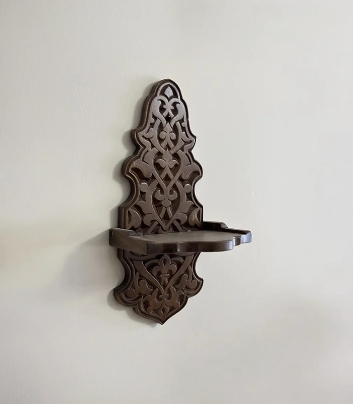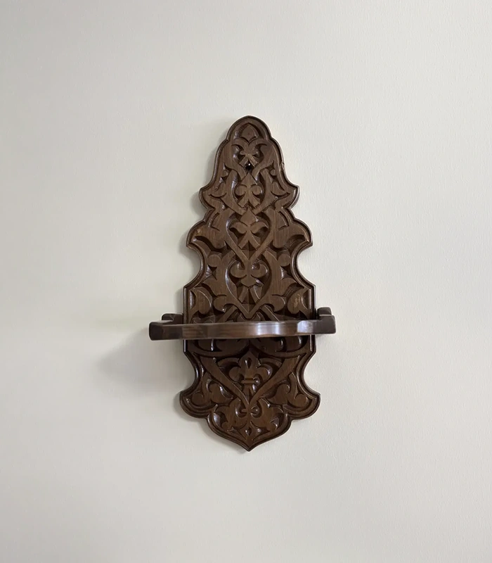 Maraş El Oyma Ceviz Kavukluk, el işçiliğiyle oyulmuş klasik desenleri ve Osmanlı motifleriyle şık bir dekoratif duvar rafıdır. Kavuk, takke veya küçük objeler için idealdir. Dayanıklı masif yapısı ve duvara monte edilebilir tasarımı ile hem estetik hem fonksiyonel kullanım sağlar.