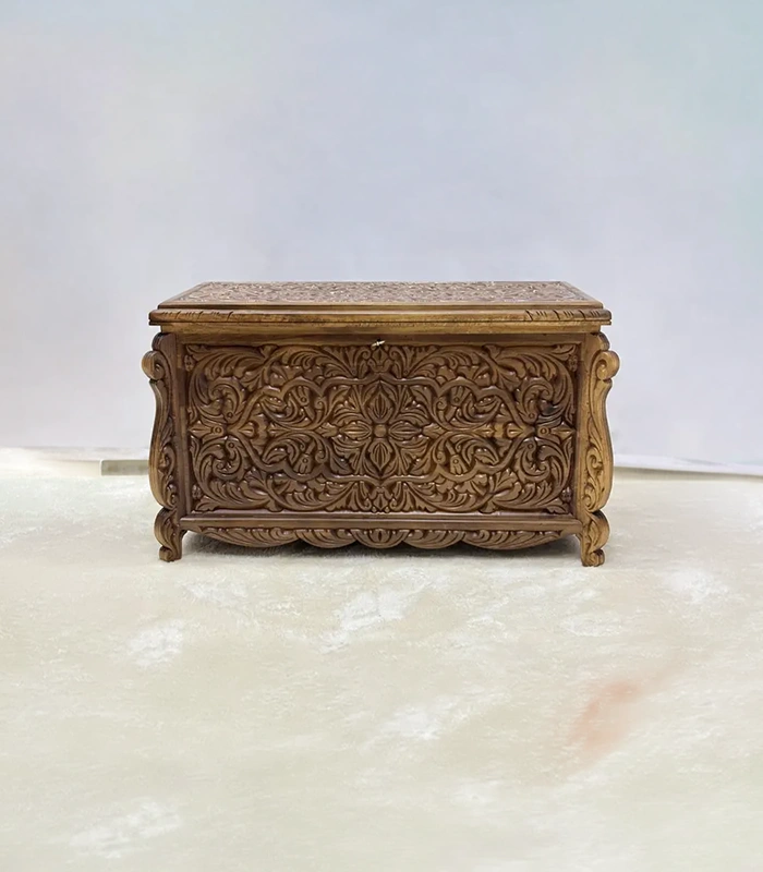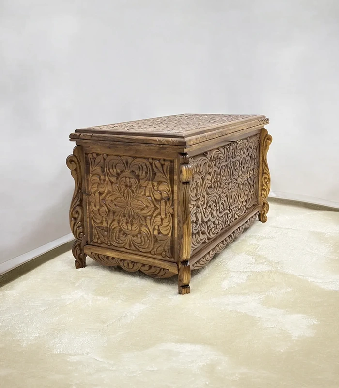 Maraş El Oyma Ceviz Ahşap Büyük Boy Çeyiz Sandığı, %100 doğal fırınlanmış kök ceviz ağacından üretilmiştir. Dayanıklı yapısı ve uzun ömürlü kullanımı ile zamana meydan okur. Ahşabın doğal damarları sayesinde her sandık eşsiz bir karakter taşır, çatlama ve bozulmaya karşı yüksek direnç gösterir.