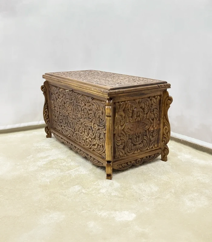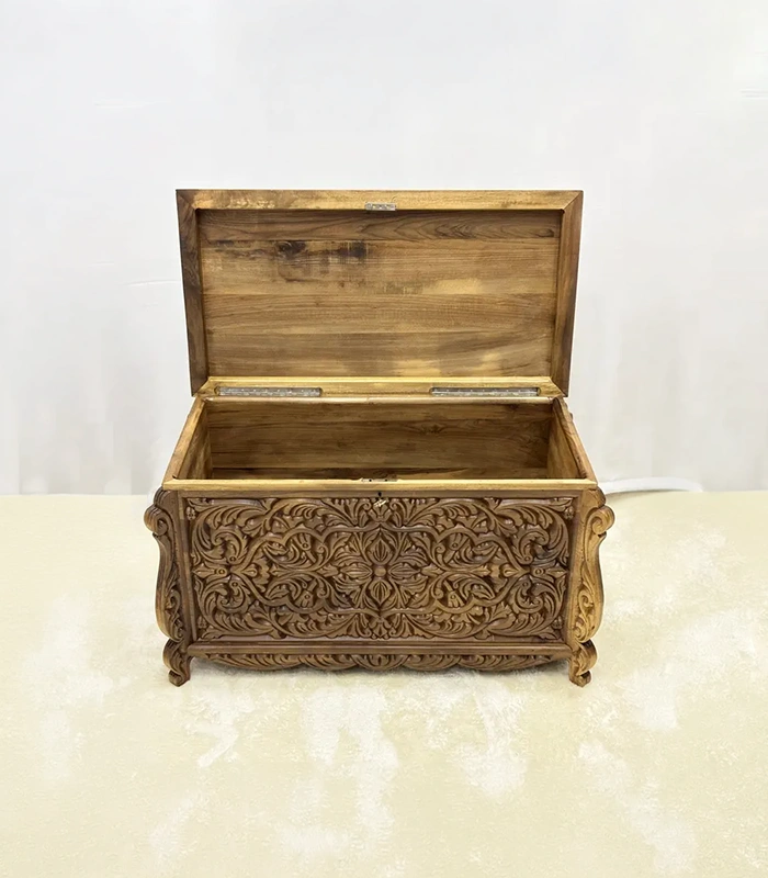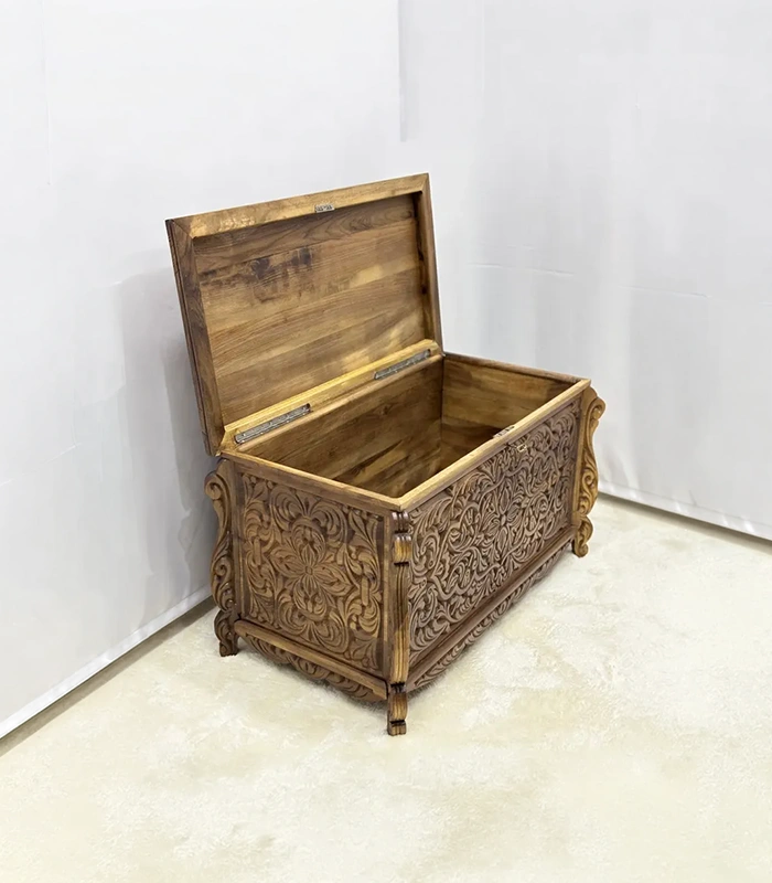 Maraş El Oyma Ceviz Ahşap Büyük Boy Çeyiz Sandığı – 95x50x60 cm | Sarmaşık Natural Model
