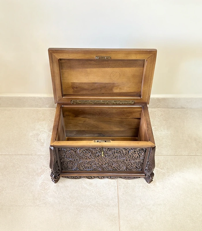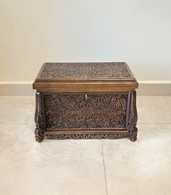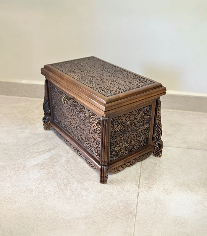 Usta eller tarafından titizlikle işlenen Ece Eskitme model el oyma desenler, ürüne nostaljik ve sanatsal bir karakter kazandırır. Her bir detay tamamen el işçiliği ile işlendiği için her sandık kendine özgü ve eşsizdir. Seri üretim değildir, bu da ürünü daha değerli ve özel kılar.