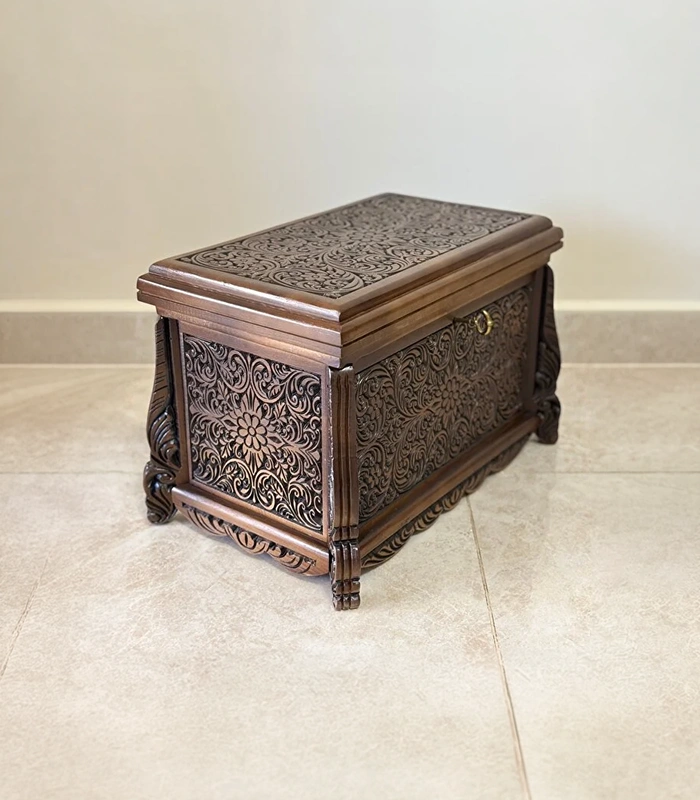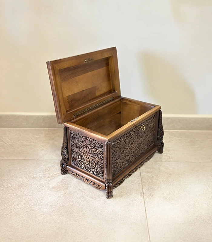 Maraş El Oyma Ceviz Ahşap Çeyiz Sandığı – 50x30x30 cm | Ece Eskitme Model