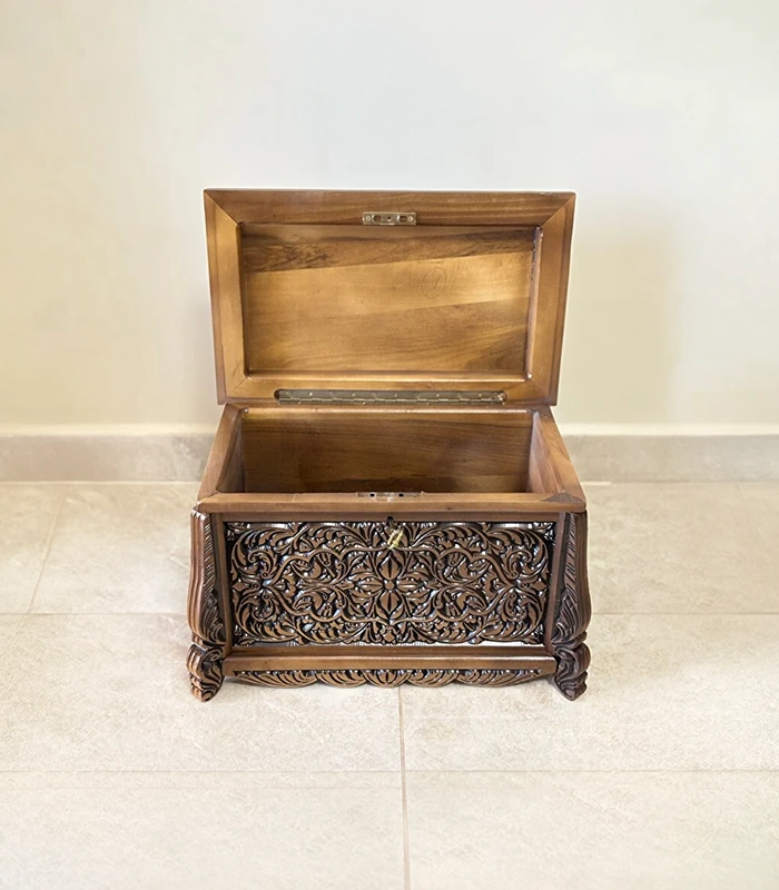 Sandığın kapak ve ön yüzeyinde yer alan sarmaşık eskitme model el oyma desenler, ürüne estetik ve otantik bir karakter kazandırır. Usta zanaatkârların titizlikle işlediği bu detaylar, her sandığı benzersiz ve sanatsal bir değere sahip hale getirir.