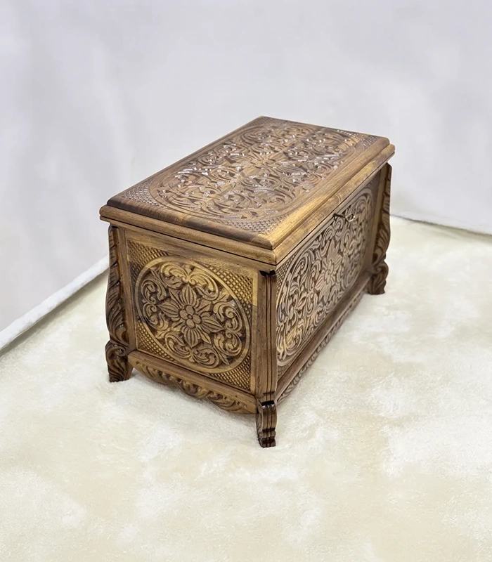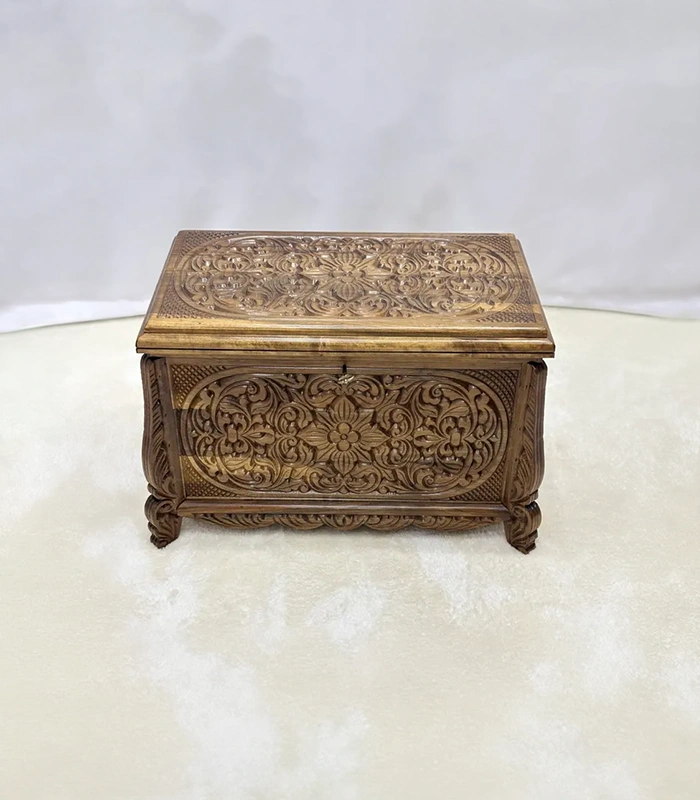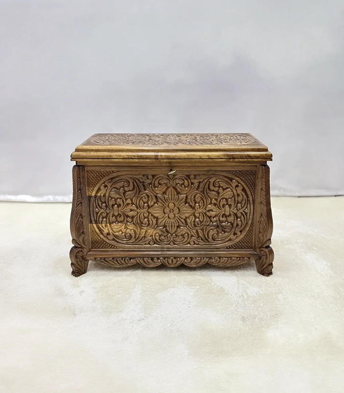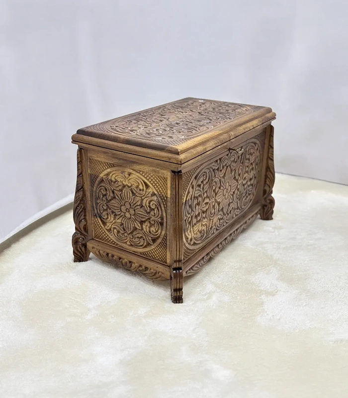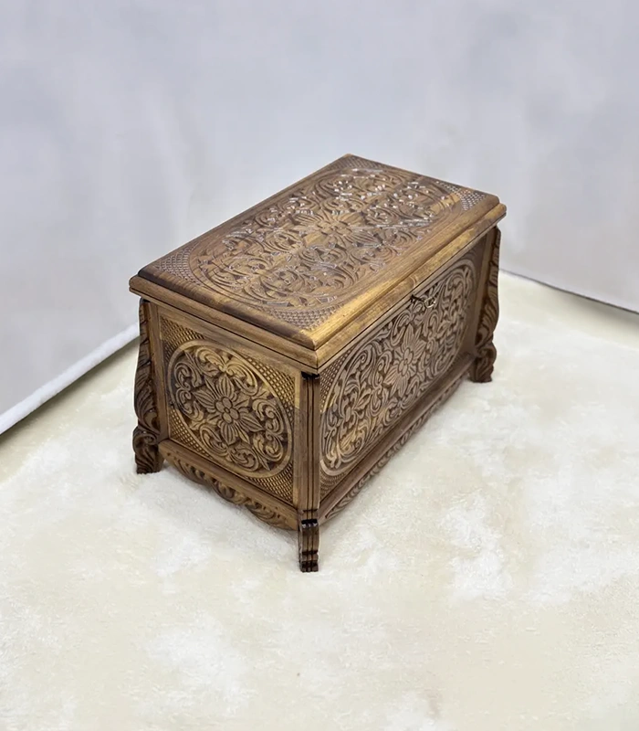 Maraş El Oyma Ceviz Ahşap Çeyiz Sandığı – Meriç Natural Model, el yapımı, zarif çiçek motifli ve kompakt tasarımı ile dekoratif ve fonksiyonel bir depolama sunar. Şimdi satın al!
