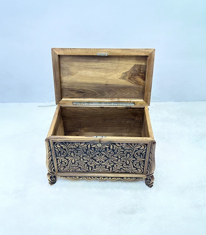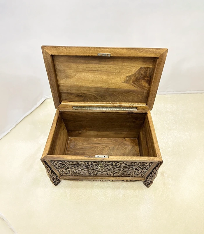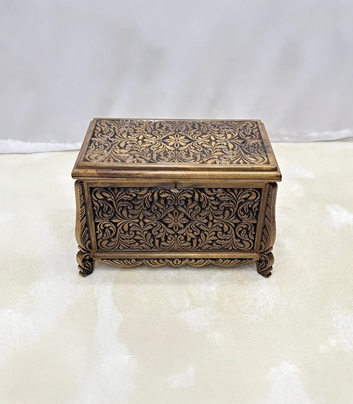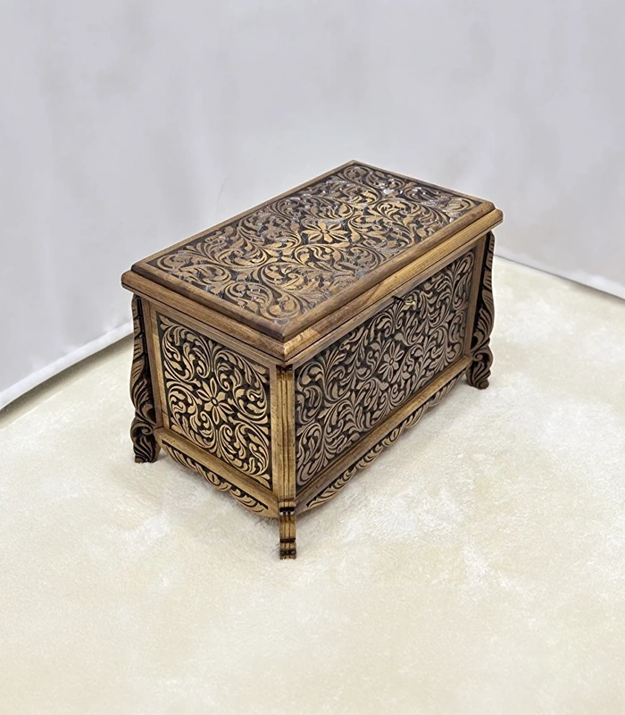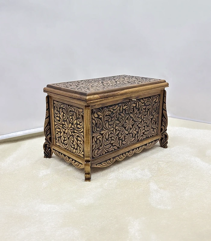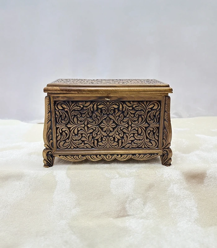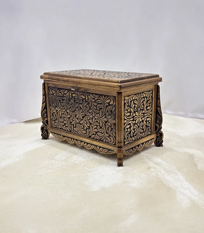 Erva Eskitme model olarak tasarlanan bu sandık, nostaljik ve klasik görünümüyle dikkat çeker. Ön ve üst yüzeyde yer alan detaylı el oyma motifler, ürüne sanatsal bir kimlik kazandırır. Her bir sandık, ceviz ağacının kendine özgü doğal desenleri sayesinde eşsiz bir görünüme sahiptir.