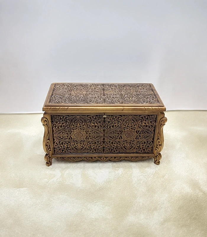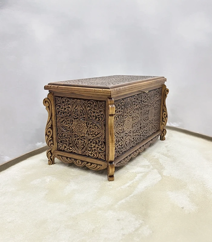 Maraş El Oyma Ceviz Ahşap Çeyiz Sandığı, geleneksel zanaatkârlığın zarafetini modern yaşam alanlarına taşıyan özel bir tasarımdır. %100 doğal kök ceviz ağacından üretilen bu sandık, fırınlama işlemi sayesinde uzun ömürlü ve dayanıklı bir yapıya sahiptir. Çatlama ve deformasyona karşı dirençli yapısı ile yıllarca güvenle kullanabilirsiniz.