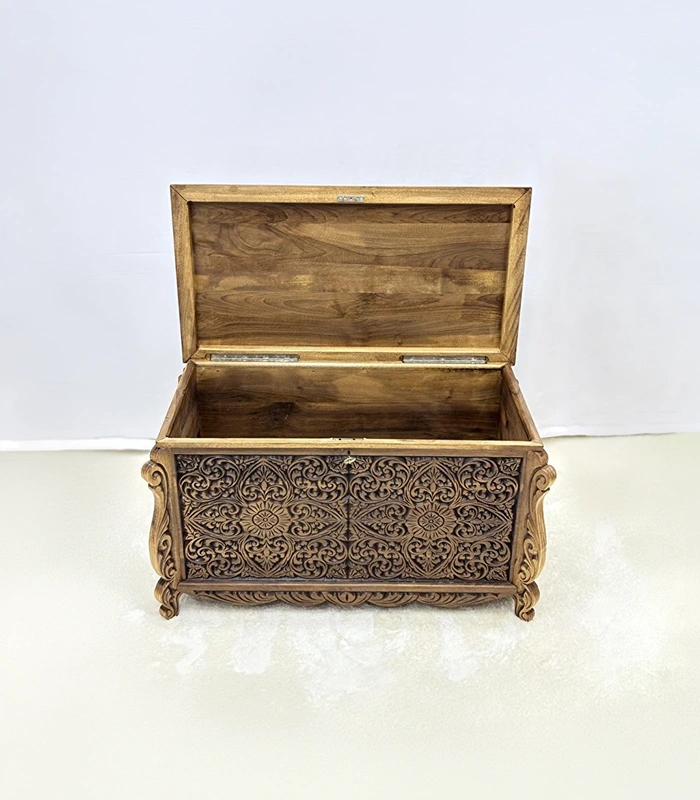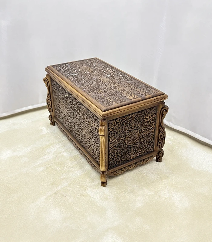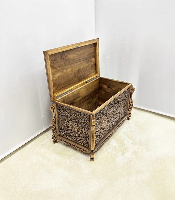 Maraş El Oyma Ceviz Ahşap Çeyiz Sandığı – 95x50x60 Cm Büyük Boy Ahşap Sandık | Leyla Eskitme