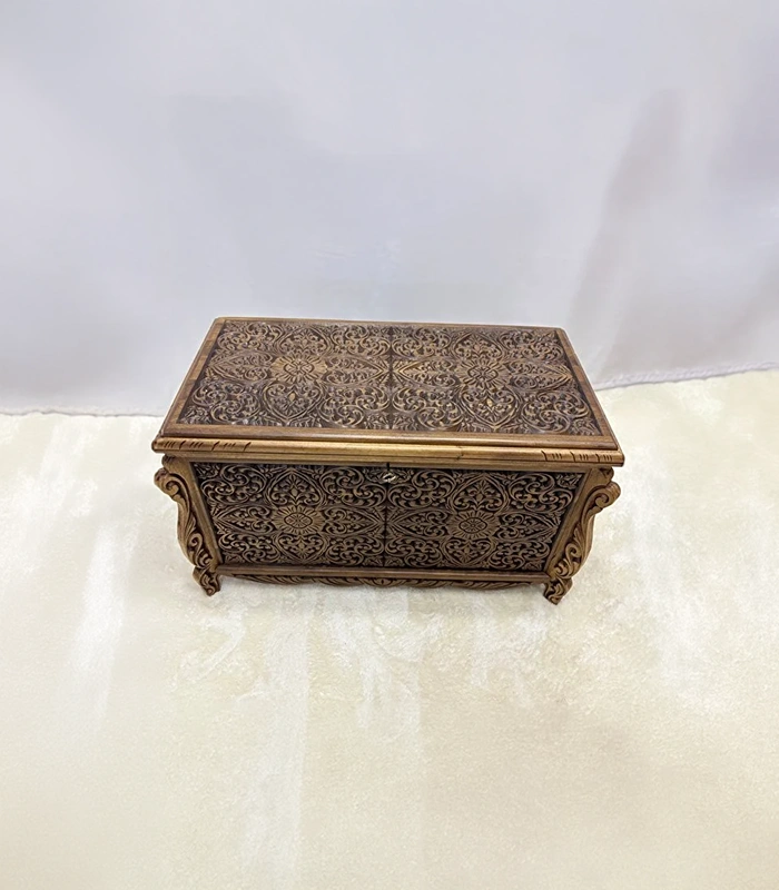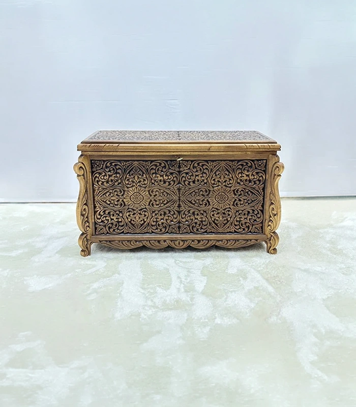 Her biri ustaların el işçiliğiyle özenle oyulan Leyla Eskitme desenleri, sandığa sanatsal bir kimlik kazandırır. Osmanlı esintili floral motiflerle süslenen yüzeyi, bulunduğu ortama estetik ve sıcak bir atmosfer katar. Doğal damar yapısı sayesinde her ürün kendine özgü ve eşsizdir.