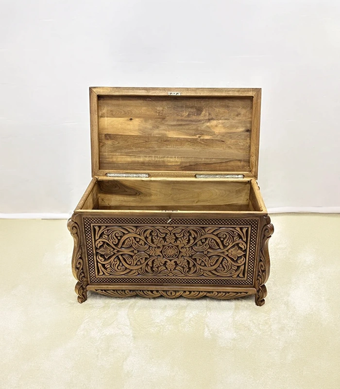 Ürünün en dikkat çekici özelliği olan Aliye Eskitme model el oyma desenler, ön ve üst yüzeyde detaylı bir şekilde işlenmiştir. Geleneksel motiflerin modern yorumuyla tasarlanan bu sandık, eskitme uygulaması sayesinde nostaljik ve antik bir görünüm kazanır. Her bir ürün, doğal ceviz damar yapısı sayesinde kendine özgü ve benzersizdir.