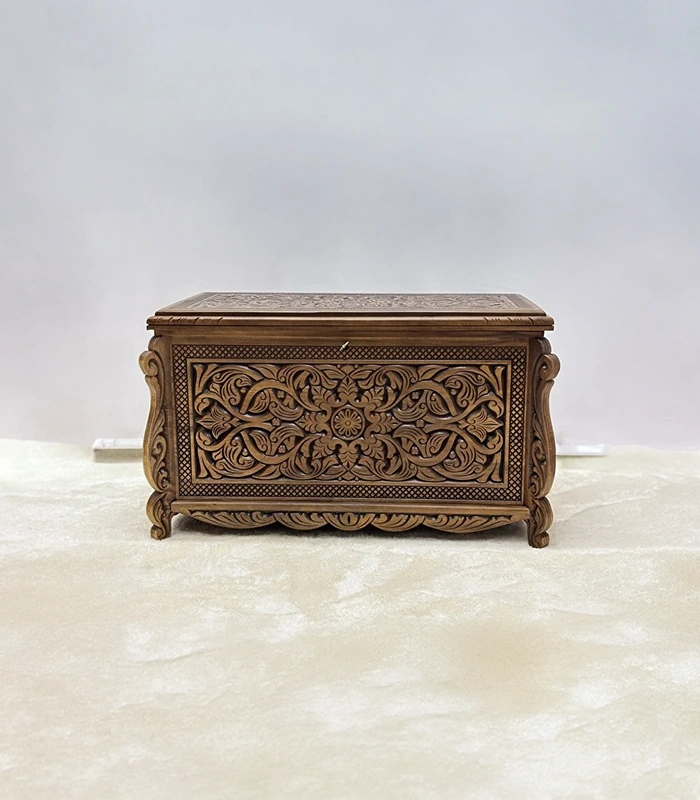 Maraş El Oyma Ceviz Ahşap Çeyiz Sandığı – 95x50x60 cm Büyük Boy Sandık | Aliye Eskitme Model
