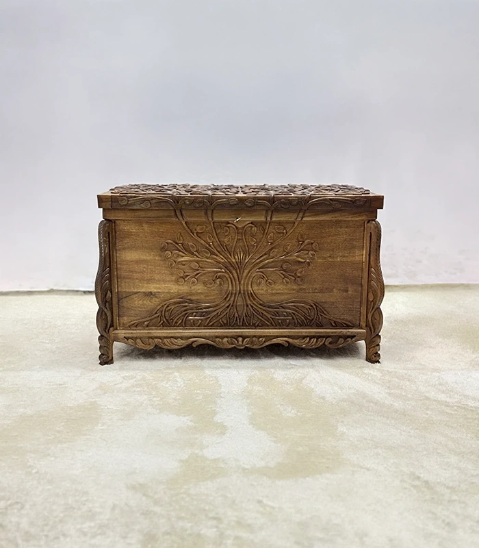 Sandığın ön ve üst yüzeyinde yer alan Hayat Ağacı motifi, köklerinden dallarına uzanan detaylı el oyma işçiliğiyle dikkat çeker. Bu özel motif yaşamı, sürekliliği ve köklü bağları temsil ederken, sandığa estetik ve manevi bir değer kazandırır.