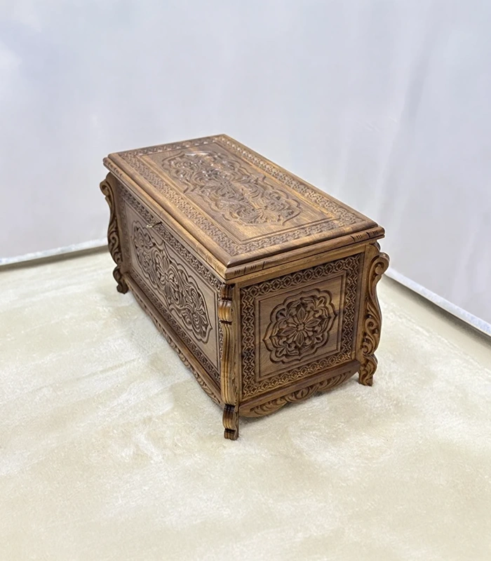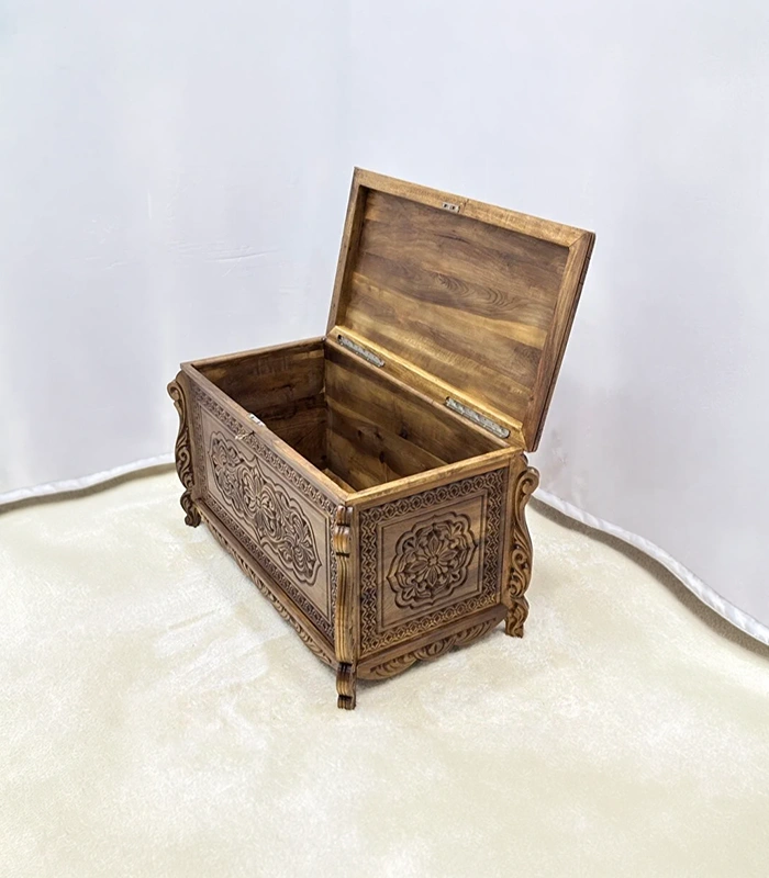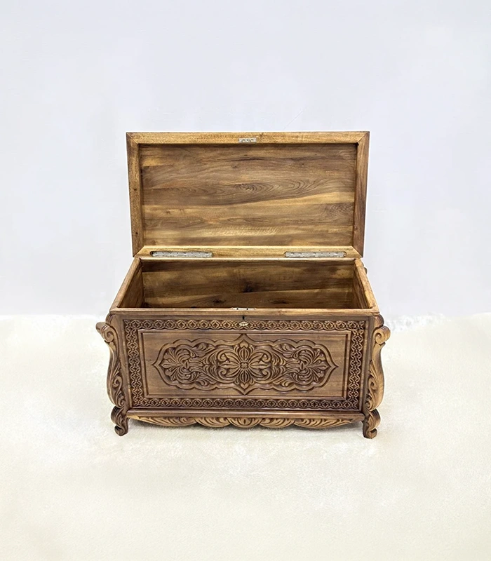 Maraş El Oyma Ceviz Ahşap Çeyiz Sandığı – 95x50x60 cm Büyük Boy Sandık | Papatya Natural Model