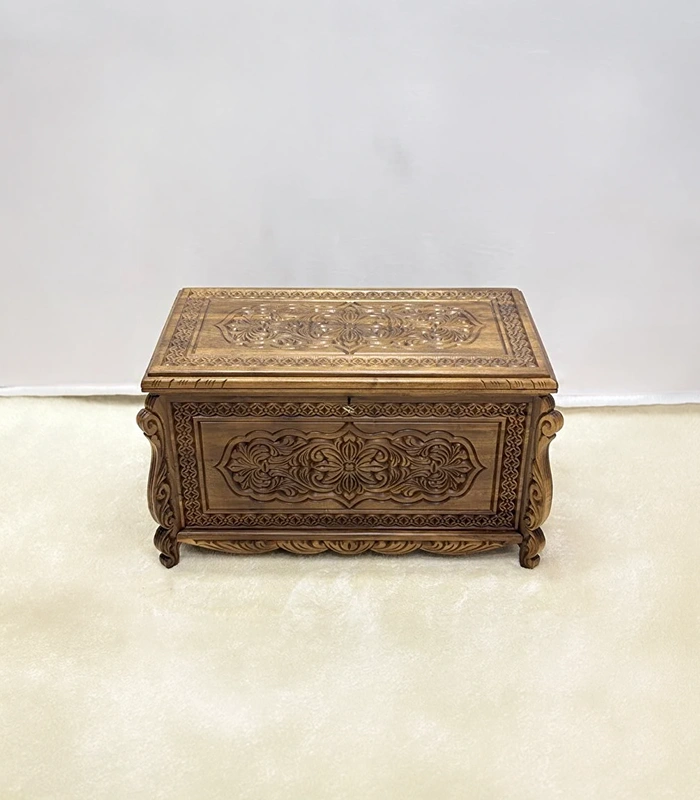 Her sandık, ceviz ağacının kendine özgü damar yapısını yansıttığı için benzersiz bir görünüme sahiptir. Papatya Natural modeli, zarif papatya motifleriyle süslenmiş olup ön, yan ve üst yüzeylerinde yoğun el oyma işçiliği bulunur. Bu detaylar ürüne klasik ve nostaljik bir hava kazandırırken yaşam alanlarınıza da estetik bir dokunuş sağlar.