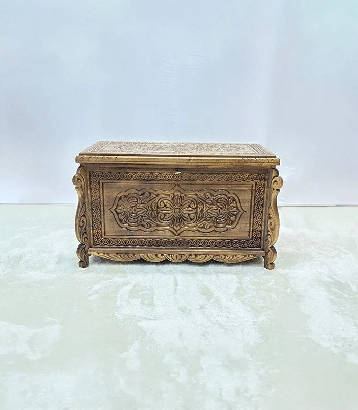 El oyma detaylara sahip Maraş ceviz çeyiz sandığı, doğal fırınlanmış ahşabı ve geniş iç hacmiyle hem dekoratif hem kullanışlıdır. Papatya motifli zarif tasarımıyla öne çıkar.