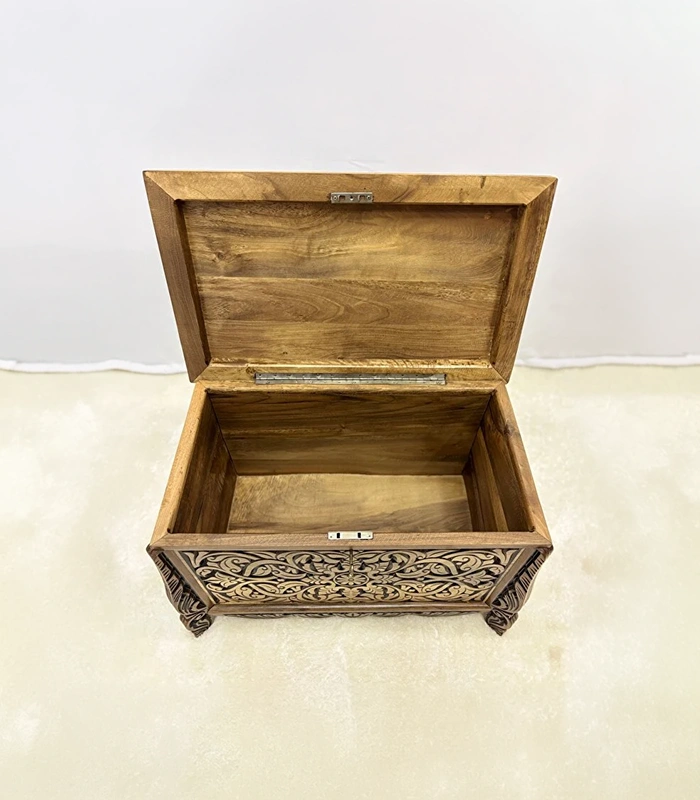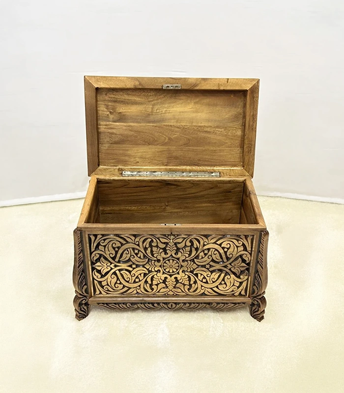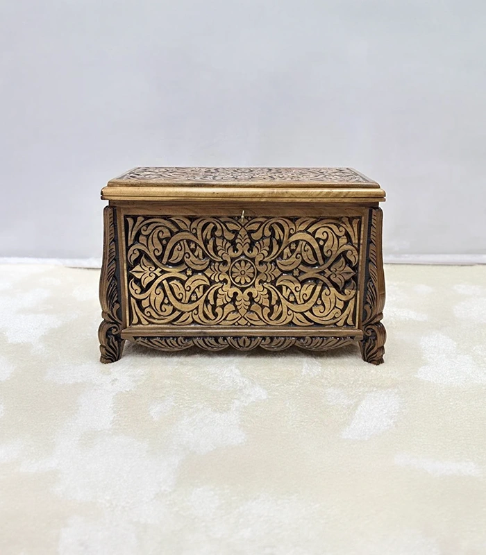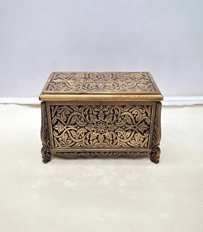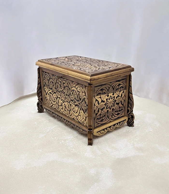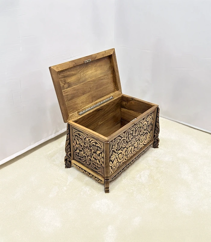 Maraş El Oyma Ceviz Ahşap Çeyiz Sandığı – Ahşap Sandık-68x40x48 Cm | Aliye Eskitme