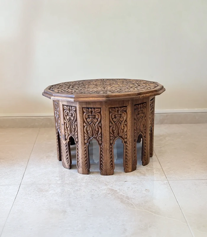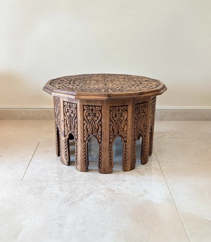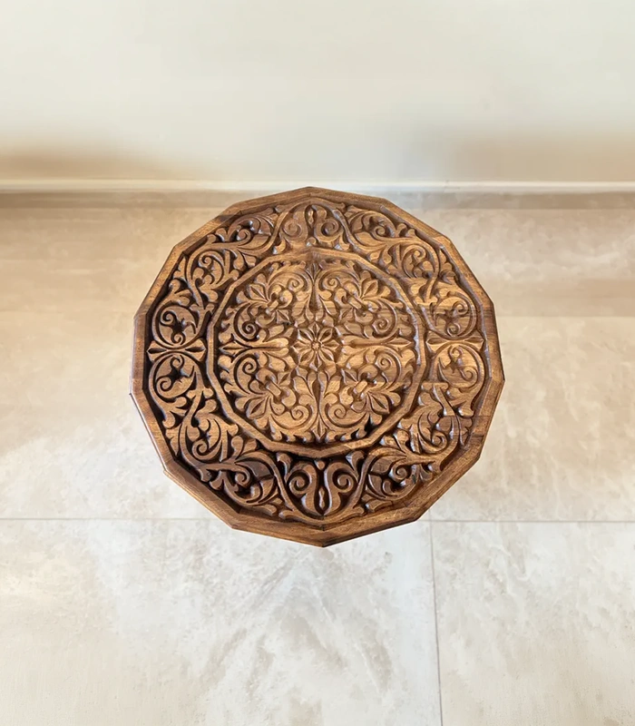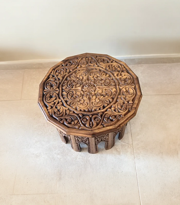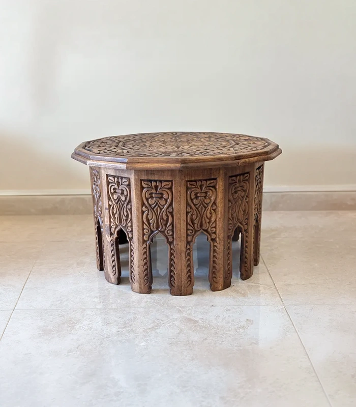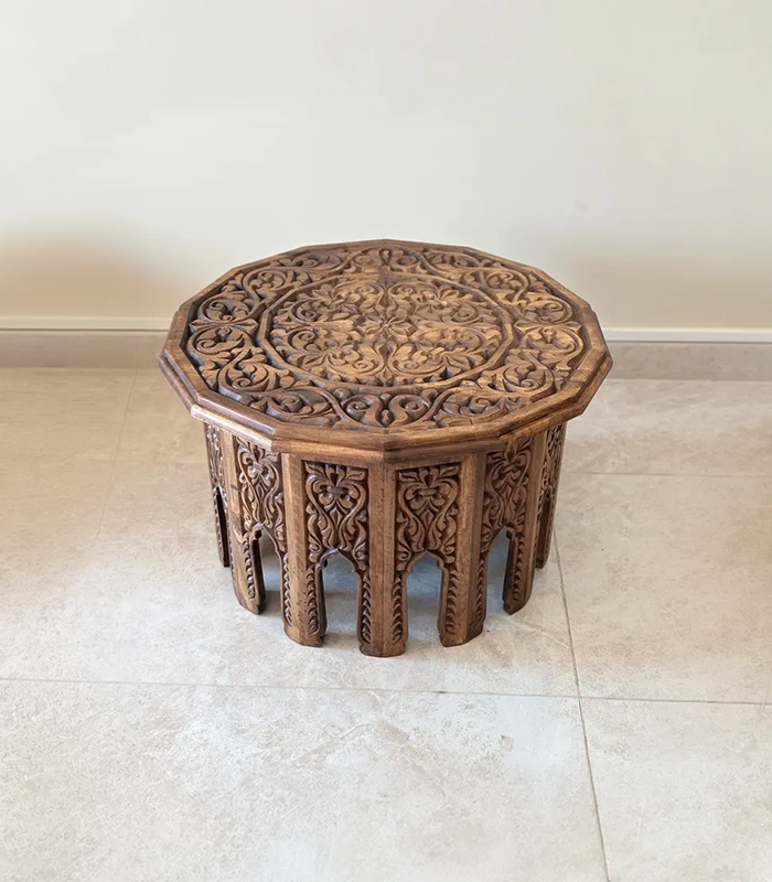 Maraş El Oyma Ceviz Ahşap Orta Sehpa – 73x73x47 cm Klasik Desenli El Yapımı Sehpa Natural