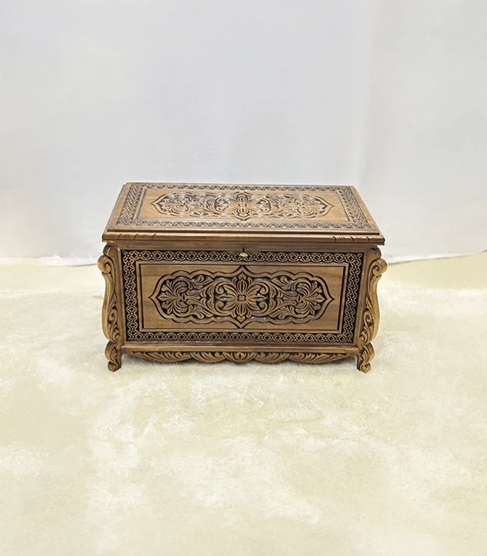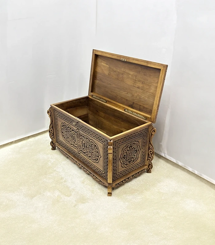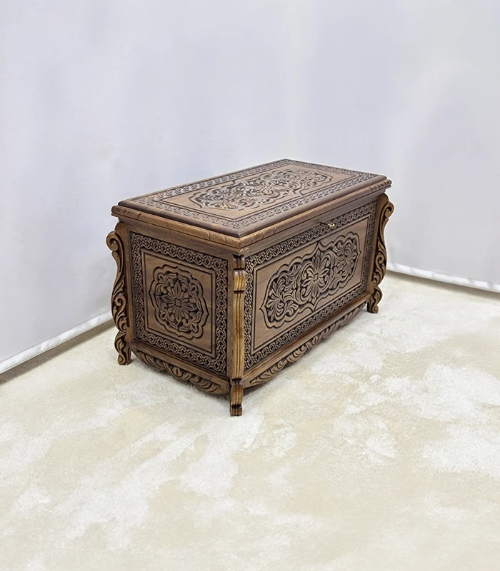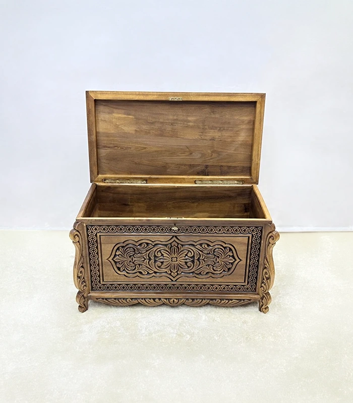 Maraş el işçiliğinin zarafetini yansıtan bu özel çeyiz sandığı, %100 fırınlanmış kök ceviz ağacından üretilmiştir. Doğal yapısı sayesinde uzun ömürlü kullanım sunarken, sağlamlığı ile yıllar boyunca güvenle kullanılabilir. Her bir ürünün kendine özgü damar yapısı, sandığı tamamen benzersiz kılar.
