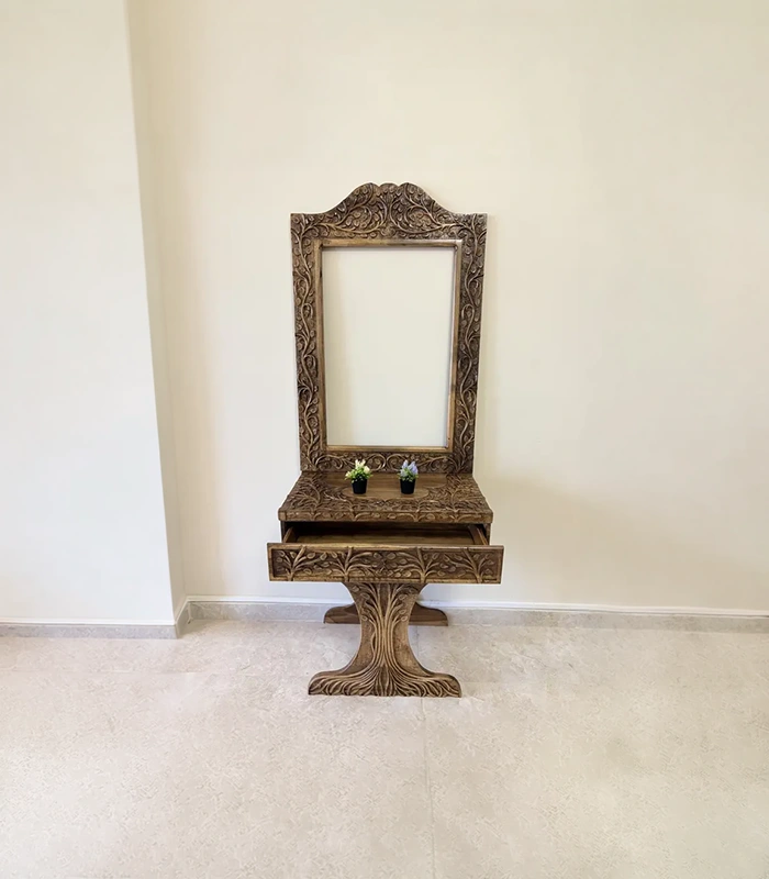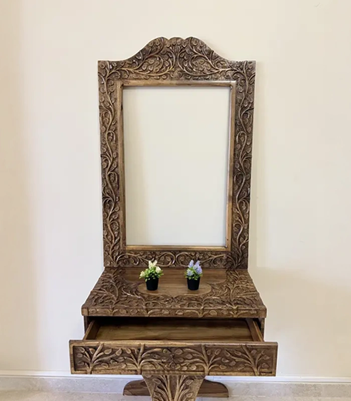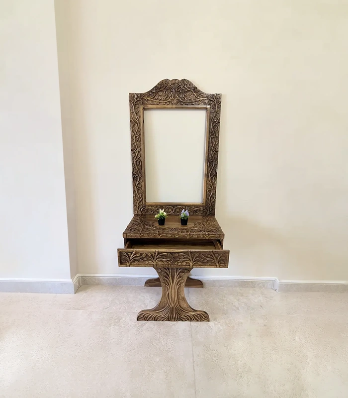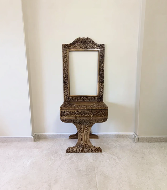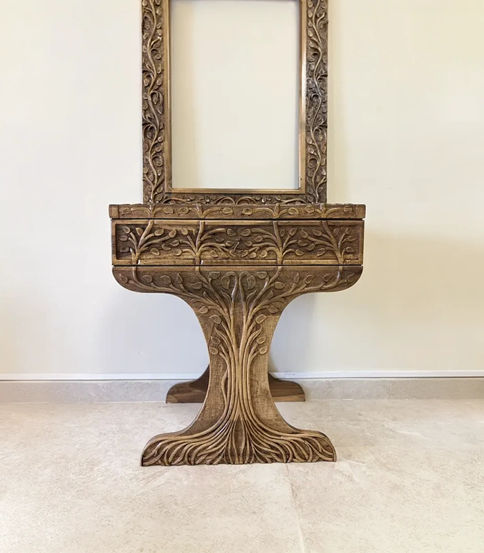 Maraş El Oyma Hayat Ağacı Dresuar – 80x45x85 cm Ayna Dahil Ceviz Ahşap Dresuar Takımı